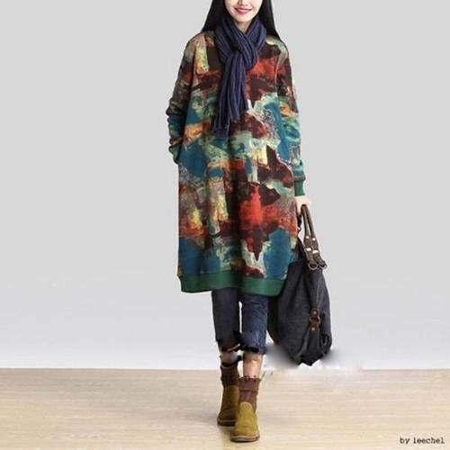 여성 기모 겨울 롱 원피스 맨투맨 후드 루즈핏 오버핏 빅사이즈 홈웨어 A라인 박시 면 라운드 플레어 니트