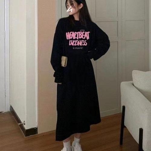 [엄지척]캐주얼 여성 겨울 기모 레터링 맨투맨 롱 원피스 치마_19870013_667501