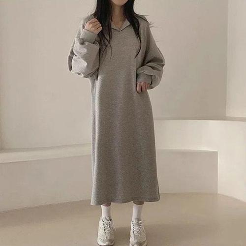 TIMEPURE 봄가을 여성 심플 오버핏 후드 긴팔 미디엄 기장 플리스 롱 후디 집업 롱 자켓 후드 롱 원피스