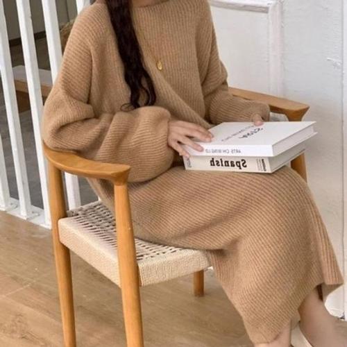 여성 반폴라 라운드 니트 원피스 미디 무릎 덮는 니트 롱 원피스