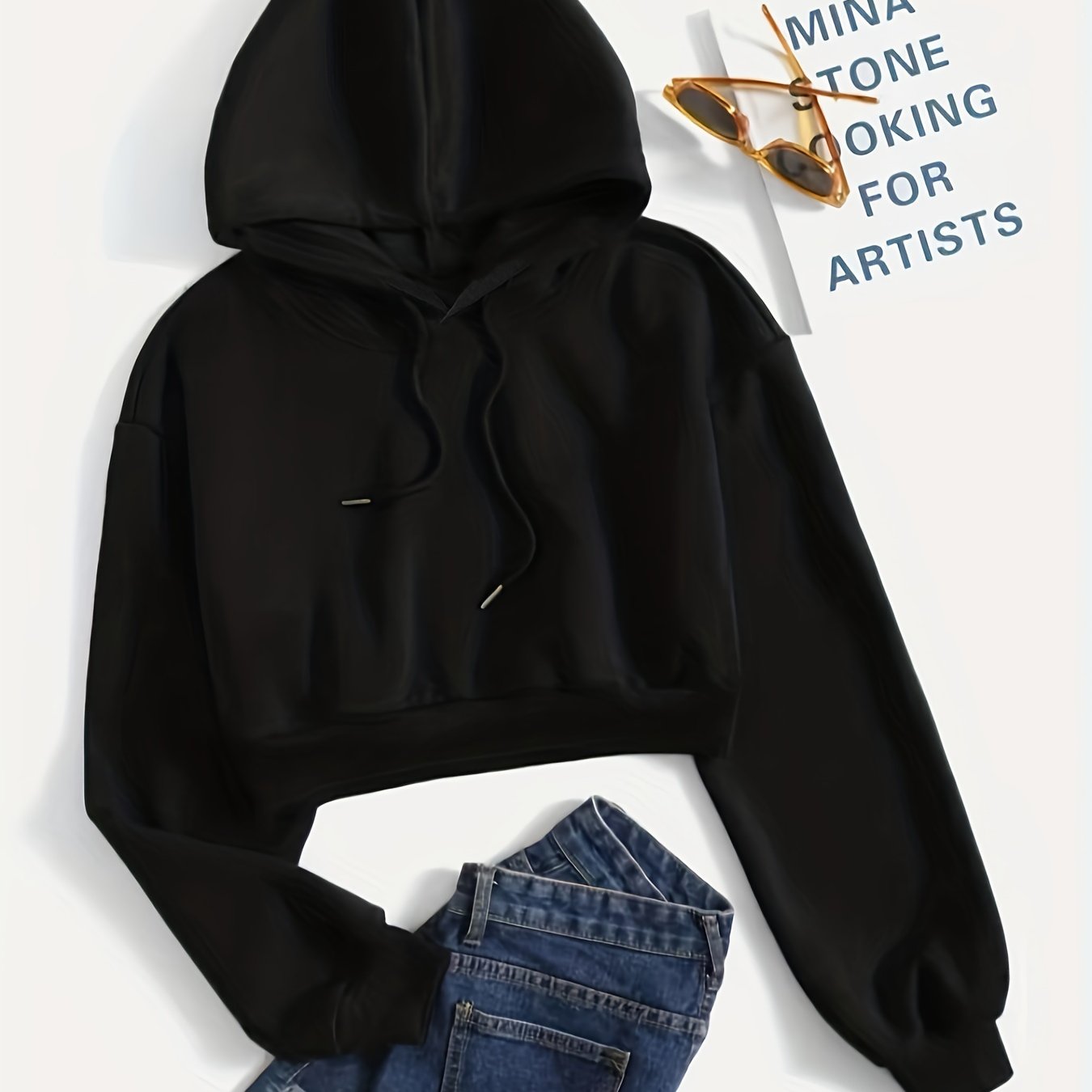 TEMU 솔리드 컬러 캐주얼 스포츠 크롭 후드 스웨트셔츠, 드로스트링 롱 슬리브 풀오버 후디, 여성 의류