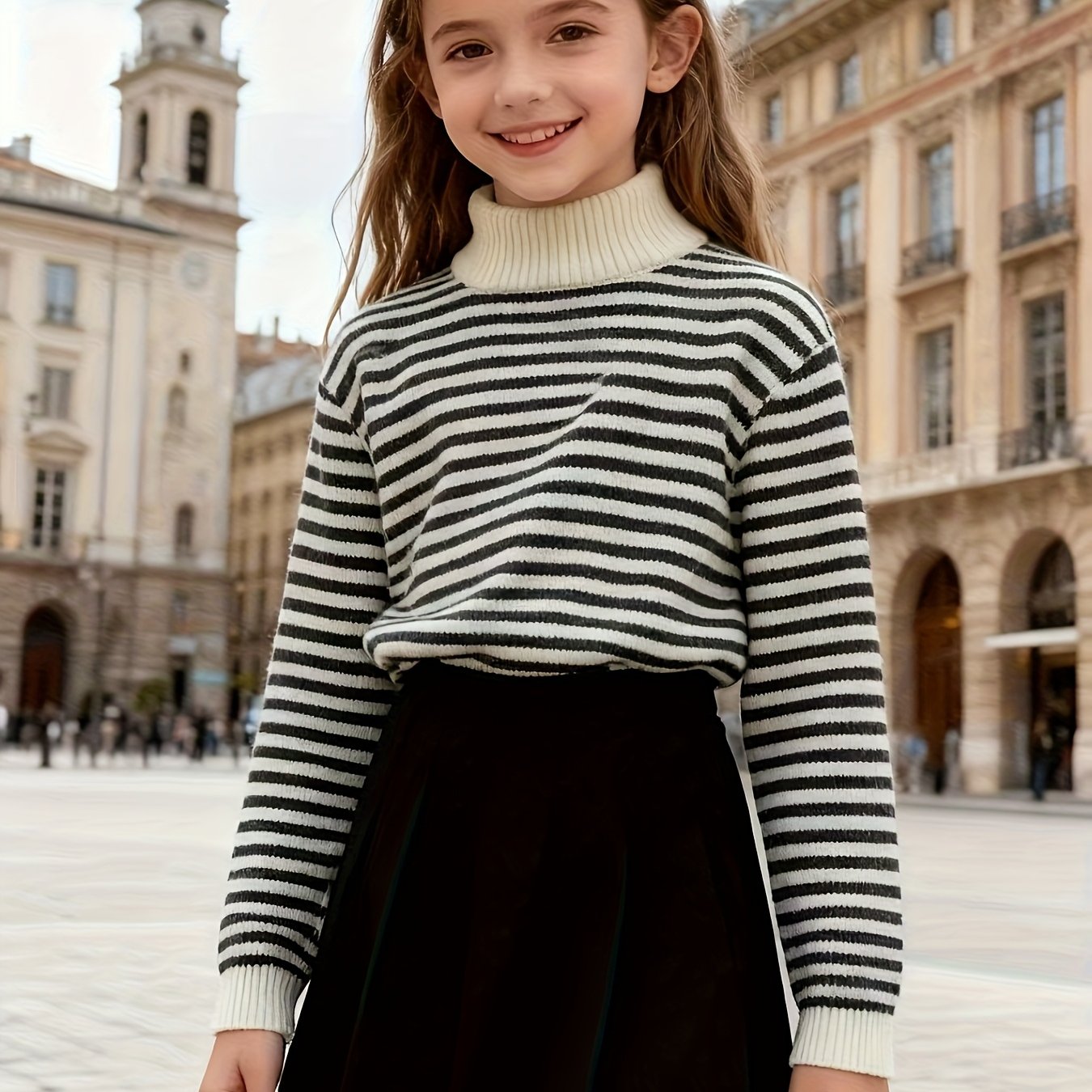 TEMU 여아 겨울 스웨터 - 부드러운 라운드넥 긴팔 풀오버, 블랙 & 화이트 가로 , 학교, 놀이, 캐주얼 외출을 위한 포근한 겨울 스웨터 - 간편한 관리 아동복, 귀여운 스웨터