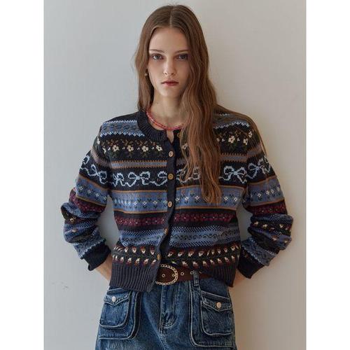 [마쟈]리본 노르딕 패턴 라운드넥 니트 가디건