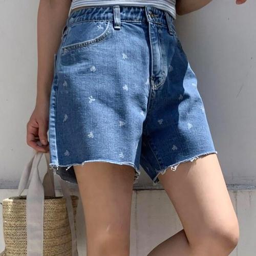 [유니제이] 멜크 밴딩 리본자수 데님 반바지