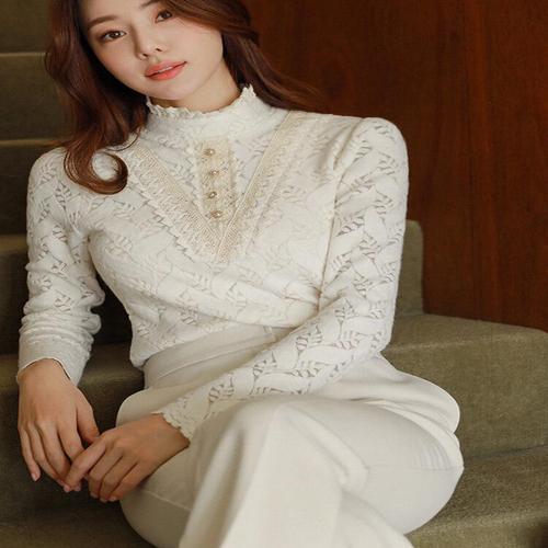 [스타일온미][루이스엔젤] 엔틱리프 기모 레이스 진주 티 블라우스