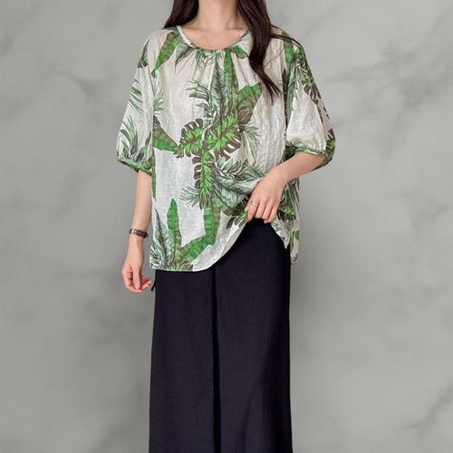 [신상오픈런]여성용 리프 패턴 라운드넥 셔링 블라우스 대형 사이즈 휴양지 스타일
