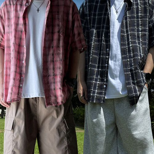 [피팅남]남자 세호 오버핏 여름 쿨 린넨 체크 반팔 셔츠 남방
