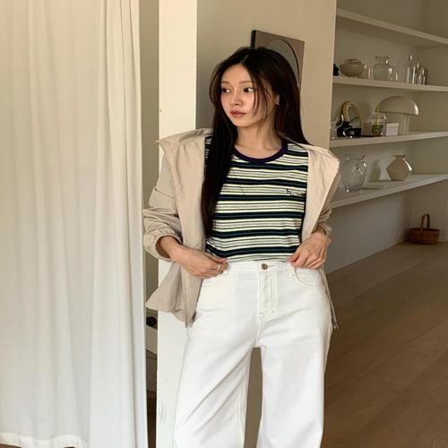헤지스 여성 스트라이프 린넨혼방 반소매티셔츠 아이보리 (HSTS5B423IV)