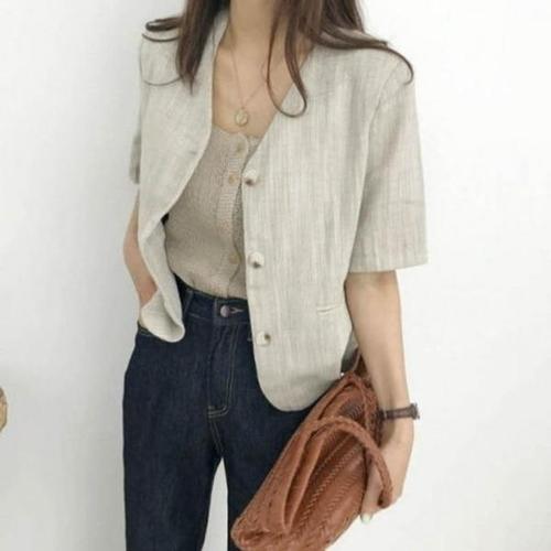 [에이치플러스몰]여성 반팔 자켓 노카라 크롭재킷 브이넥 린넨자켓