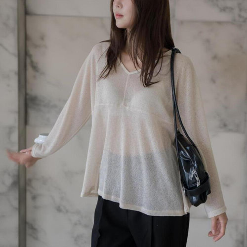 옷자락 / 여성 오버사이즈 린넨 시스루 브이넥 여리 플레어 티