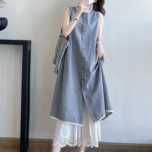 EAMT 여친 여름 빈티지 리넨 나시 풀오버 조끼 레이어드 솔리드 핸드메이드 톱 YJ2