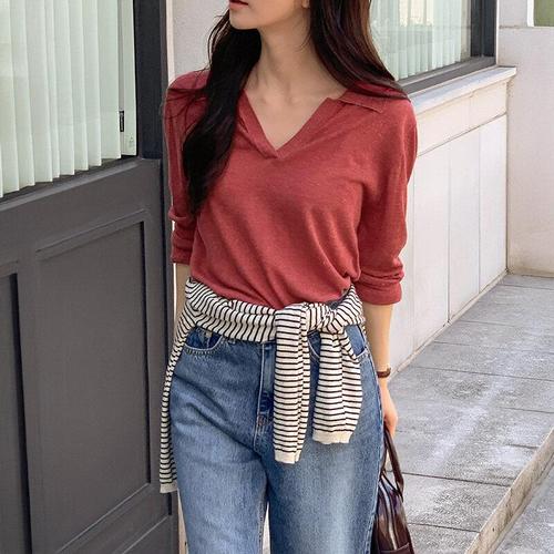[모어렌][모어렌] [MADE] 르넬 린넨 트임 카라 니트[tnt0789]