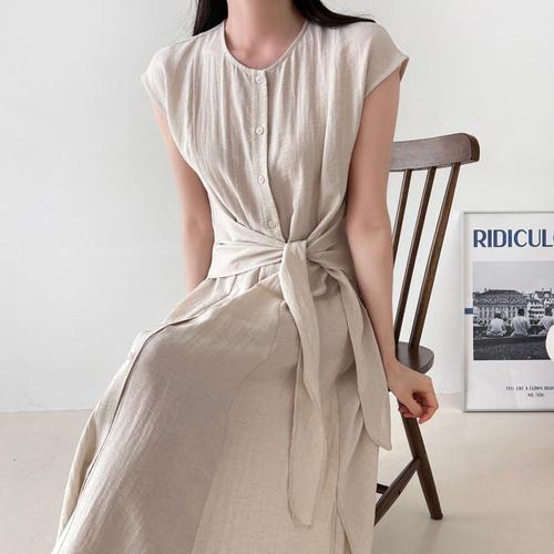 여성 앞단추 린넨 허리스트랩 캡소매 미디원피스 NYS-WDR-4694-연베이지