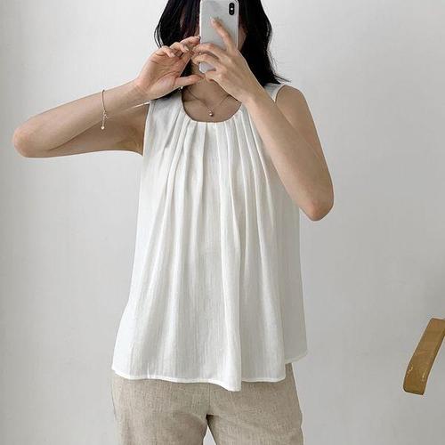|CSH3F7C|여자 핀턱 라운드 뒤트임 맞주름 린넨 나시 블라우스