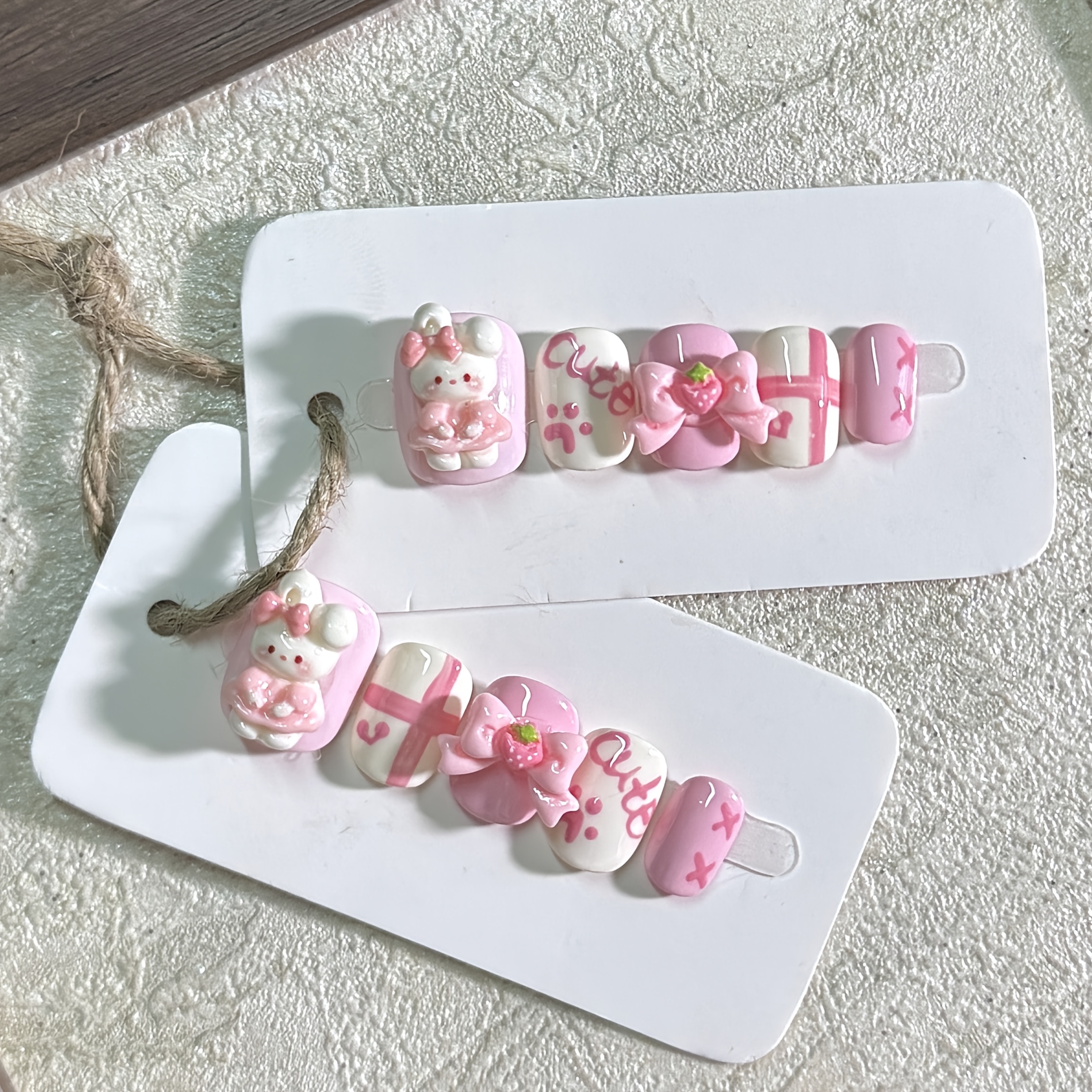 TEMU 10개입 핸드메이드 프레스온 네일 - 드레스를 입은 토끼와 귀여운 리본, 핑크 & 화이트 네일 아트, 데일리웨어, 휴일, 모임, 파티에 완벽한 섬세하고 달콤한 디자인, 매니큐어,특별한 날을 위한 네일,여성스러운 네일,달콤한 디자인,상세한 아트워크,고품질 네일,짧은 프레션,장식용 못,뷰티 러버스,여성 패션