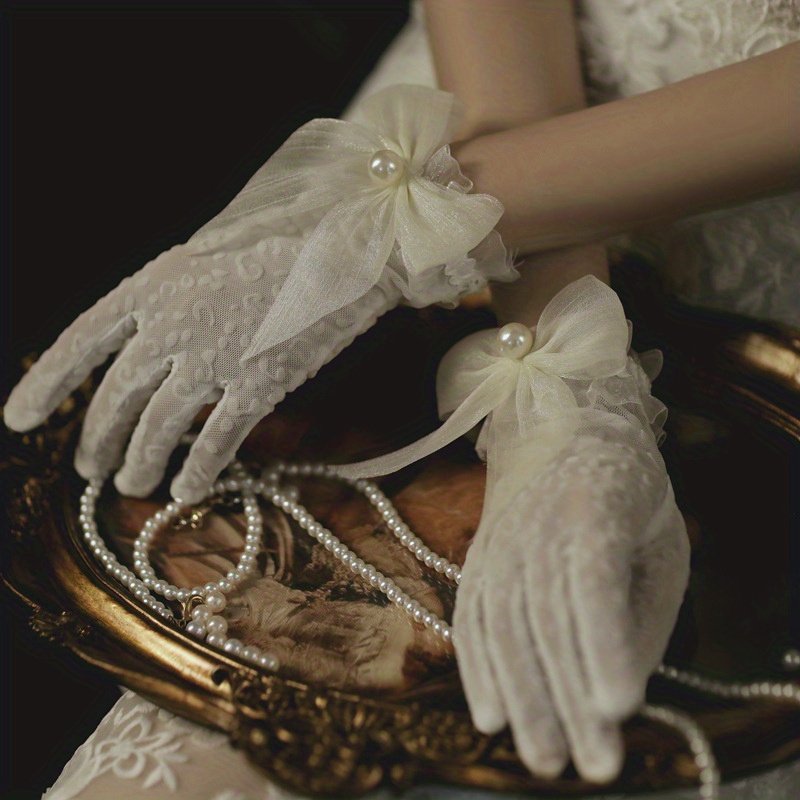 TEMU 신부용 레이스 웨딩 장갑, 크리미 화이트 숏 스타일, 리본 포함 다섯 손가락 숏 장갑, 데일리웨어 및 사진 촬영용