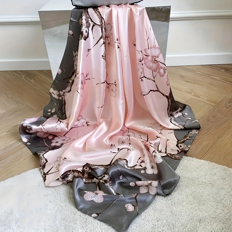 TEMU 35.4인치 여성용 플로랄 프린트 스퀘어 스카프 - 소프트 새틴 마감, 가벼운 핑크색 사슴과 새 디자인의 캐주얼 아웃팅 및 레저 액세서리용 스타일리시 숄 | 매끈한 질감