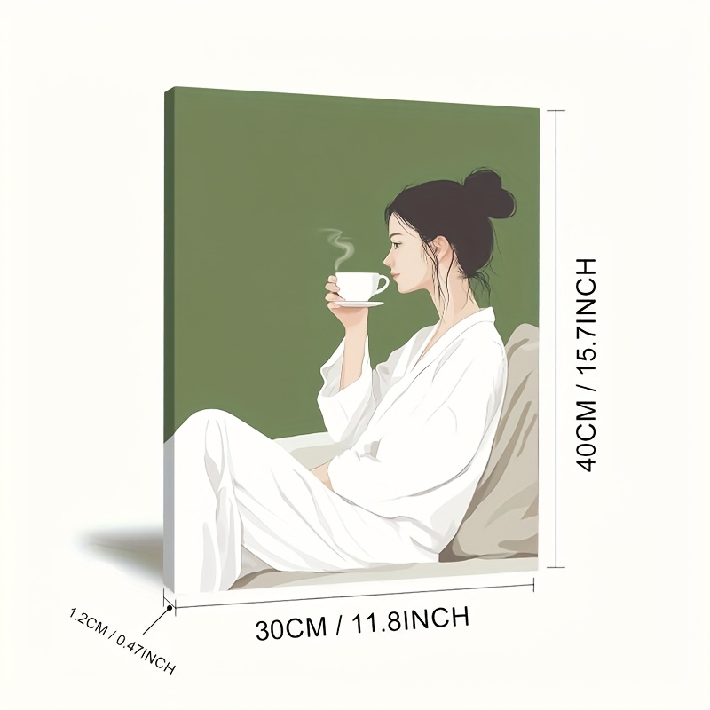 TEMU 2D 플랫, 1개 액자 캔버스 벽 예술 - 우유빛 녹색 배경의 우아한 여성이 커피를 마시는 아트 데코, 거실/침실/사무실용 준비된 걸이형 래핑 캔버스, 홈 장식에 이상적인 선물