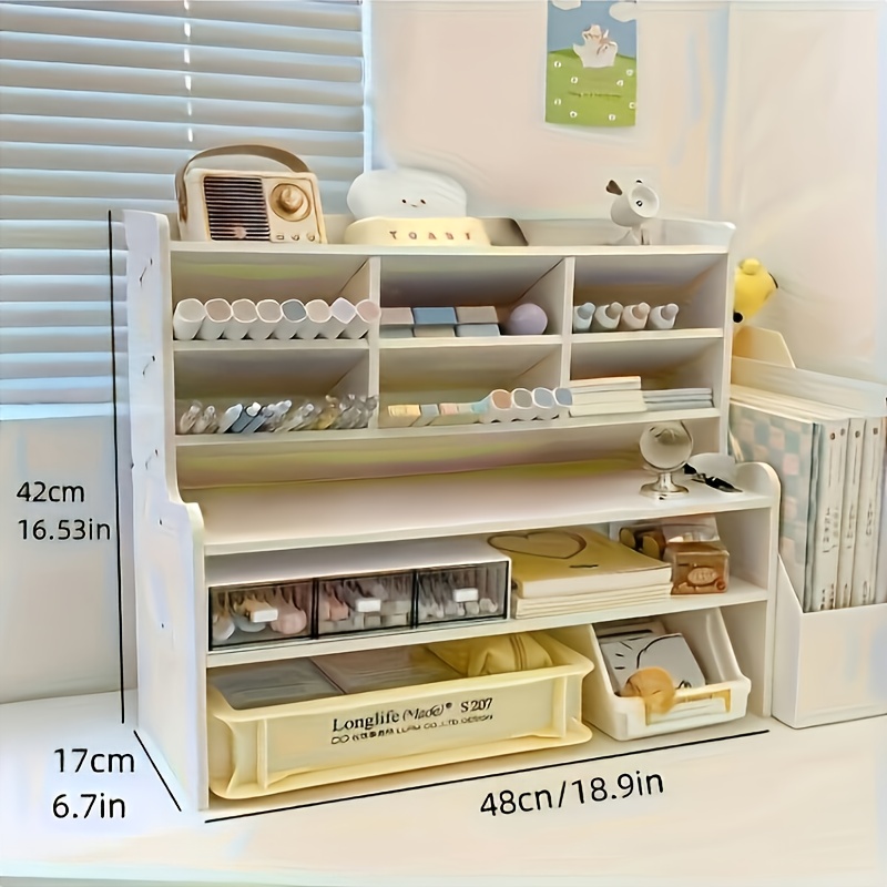 TEMU 업그레이드된 두꺼운 이중 레이어 데스크탑 책장 | 기숙사, 사무실, 문구 및 책 보관을 위한 작은 수납 랙에 적합, PVC 재질, 페인트 마감|책장