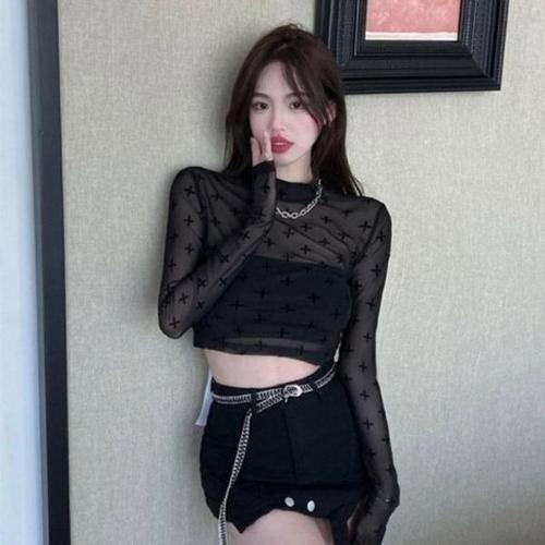 여자크롭티 시스루티셔츠 망사 메쉬 레이어드티