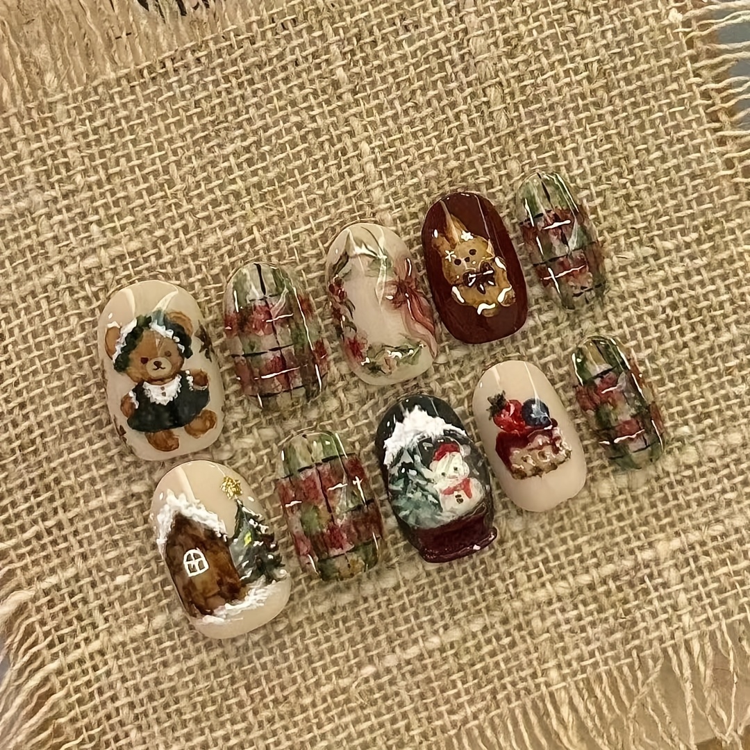 TEMU 30개 NAIL NINA 크리스마스 네일 아트 손톱, 토끼 곰 눈사람 체크무늬 눈꽃 광택 네일 익스텐션 - 겨울 휴일 프레스 네일, 타원형 중간 길이 / 크리스마스 매니큐어|네일아트