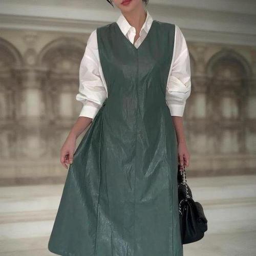 [다잇템_패션]여성 옆버클 레더 V넥 에이라인 롱드레스