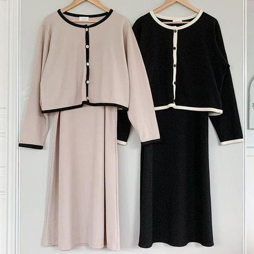 [다잇템_패션]여성용 롱드레스 와플배색 가디건과 U넥 세트