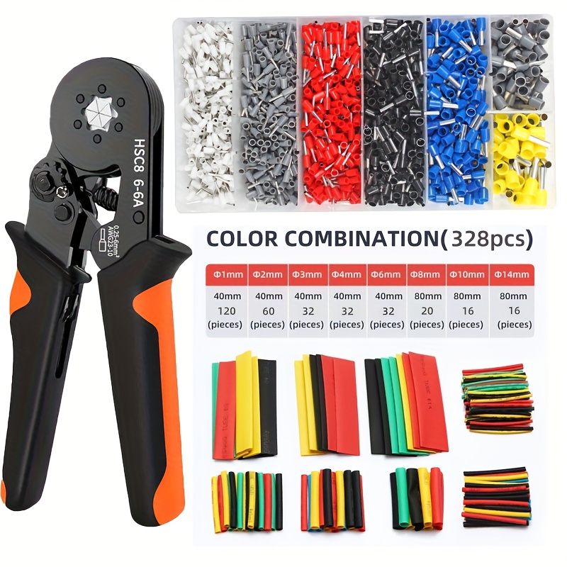 TEMU 2328개 미니 전기 압착 키트, HSC8 6-6A 압착 펜치에 적합 (0.25-6Mm² / AWG23), 7가지 크기의 VE 튜브형 단자 2000개 + 열수축 튜브 328개 포함, 내구성 좋은 플라스틱 핸들 및 전선 수리 클립