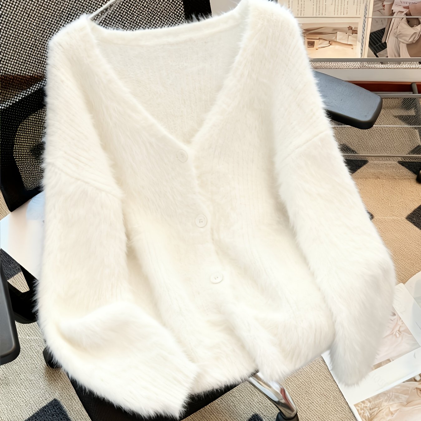 TEMU 여성을 위한 새로운 가을/겨울 빈티지 루즈핏 포근한 V넥 스웨터 가디건, 푹신한 긴소매 특징