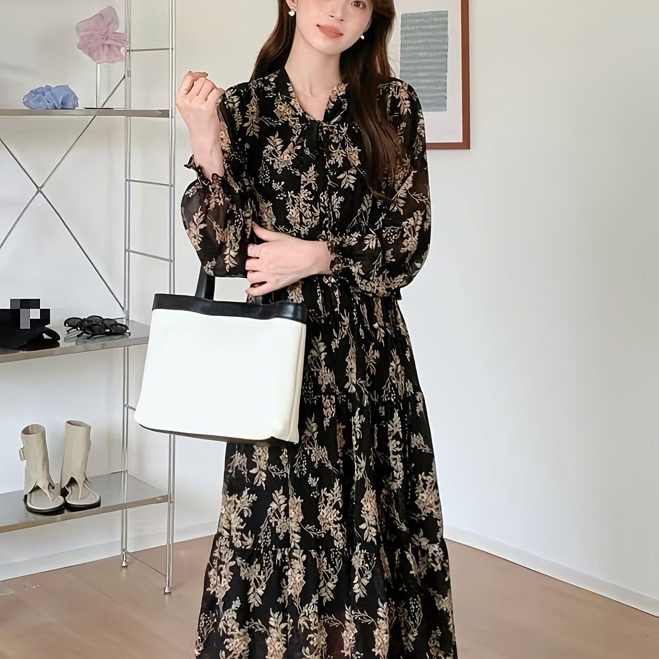 TEMU 여성용 우아한 플로럴 프린트 맥시 드레스 - 포켓이 있는 플로이 A라인 실루엣, 파티, 사무실 및 일상복을 위한 올 시즌 시크한 의상 - 여성용 포멀 & 캐주얼 드레스, 파티 드레스, 오피스룩, 세련된 스타일, 고품질 원단, 여성 원피스, 파티 원피스, 여름 원피스, 포켓 원피스, 플로럴 프린트 원피스