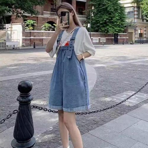 멜빵 점프수트 오버롤 데님 반바지 여자 롤업 청 WFLPTN5