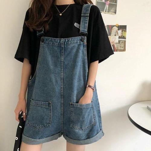 [셀러허브_여성트랜드패션]여자 공항 패션 멜빵바지 휴가 룩 청 반바지