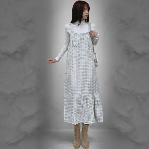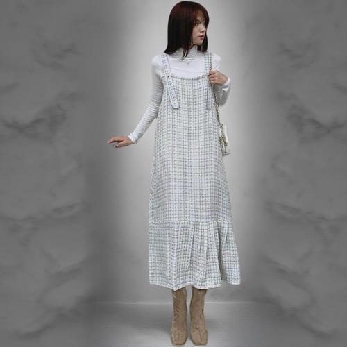 [옷자락]여성 러블리 트위드 핀턱 플레어 멜빵 롱 원피스