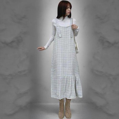[옷자락] 여성 사랑스러운 트위드 핀턱 플레어 멜빵 롱 드레스