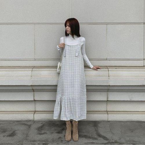 [옷자락] 여성 러블리 트위드 핀턱 플레어 멜빵 롱 원피스