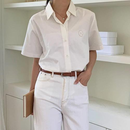 [옷자락]여성 자수 스트레이트 무지 코튼 반팔 남방