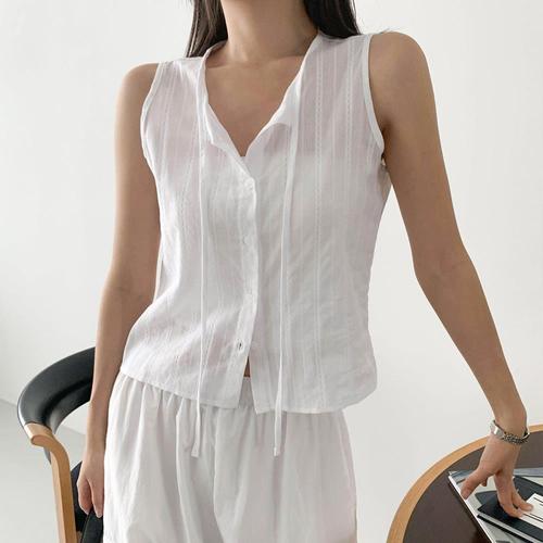 [신상오픈런]여성 프릴 포인트 리본 유넥 화이트 코튼 나시 블라우스