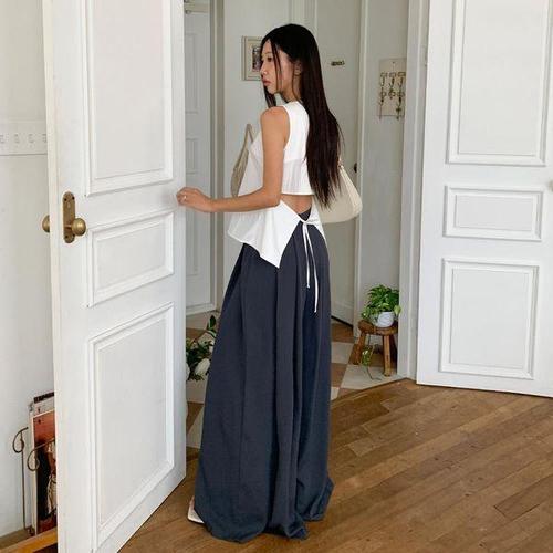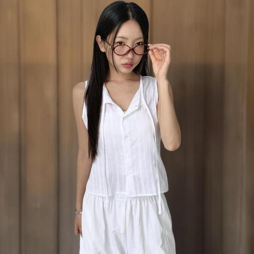 [다잇템]여자 면원단 스트랩 슬리브리스 슬릿 블라우스