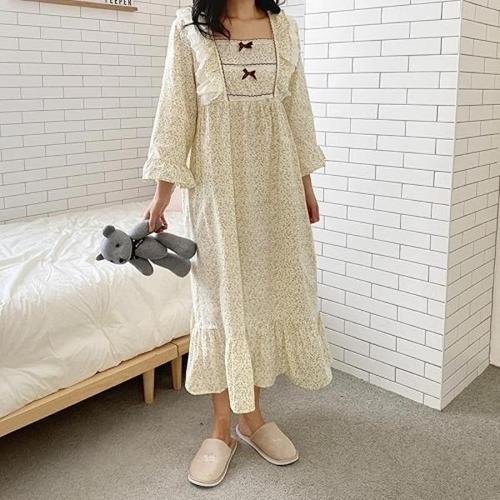 [신상오픈런]|CDO2BF4|모포도 프릴장식 파자마 스퀘어넥 코튼 매듭 긴원피스 여성_18169321_597559