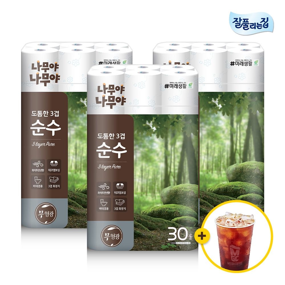 [기프티콘 증정] 나무야나무야 도톰한3겹 순수 27M 30롤 x 3팩 (90롤)