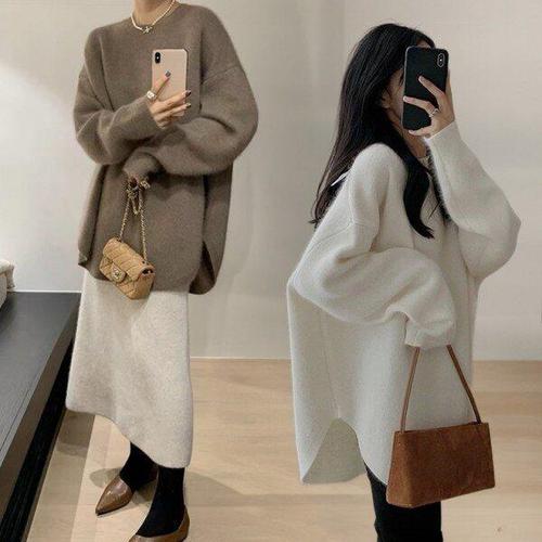[모노무드]MNO 데일리룩 걸 와이드핏롱니트 가을철 겨울철 크루넥 울 뜨개탑 니트 핑크 빨간색 블랙컬러
