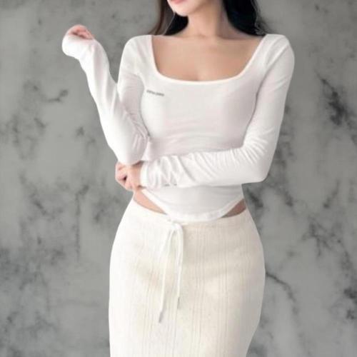 [옷자락]여성 면 모달 글자 프린트 트임 슬림핏 스퀘어넥 긴팔티셔츠