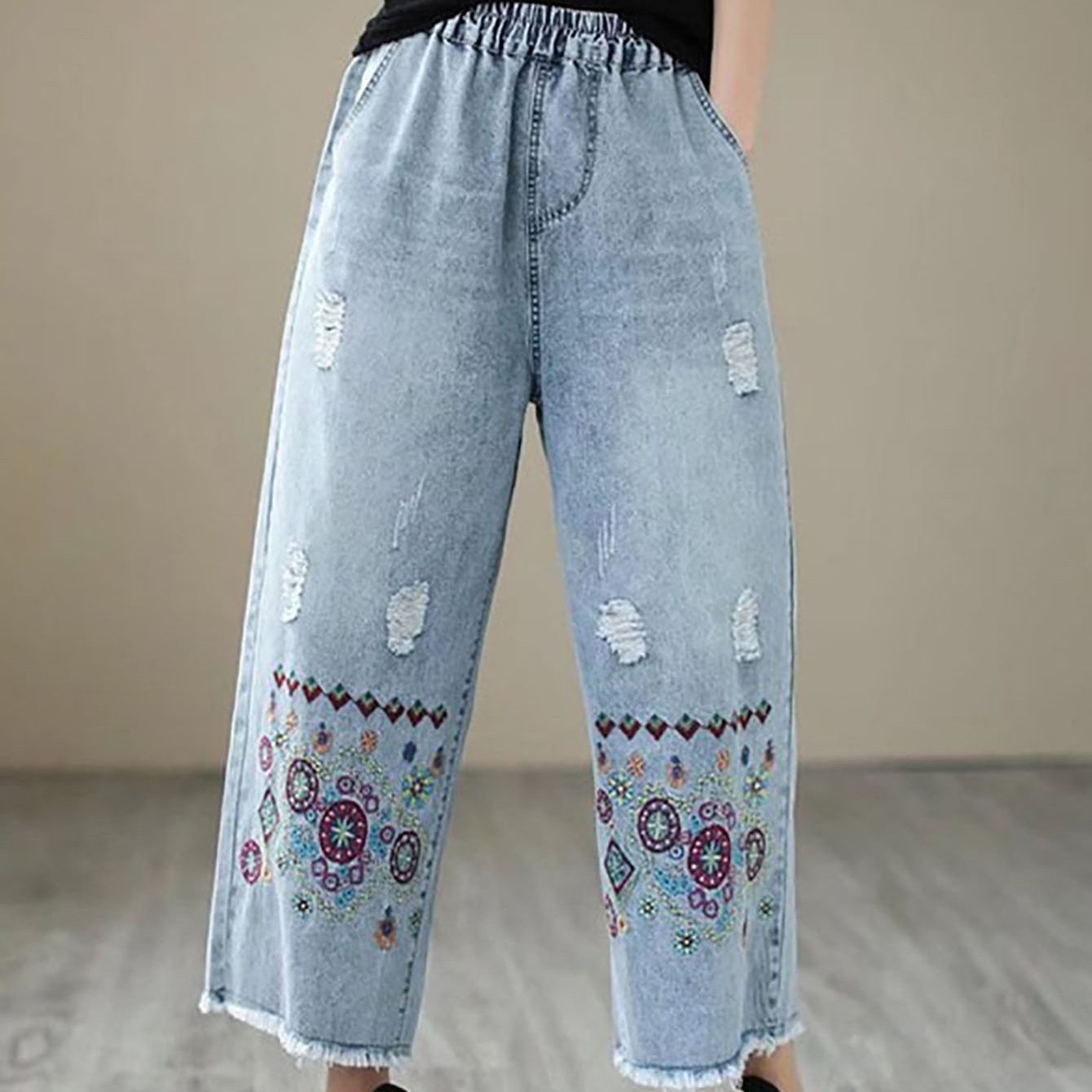 TEMU 여성 봄여름 9부 청바지 자수 찢어진 루즈핏 허리밴딩 와일드팬츠 빈티지 캐주얼 연블루 포켓 디자인 에스닉풍