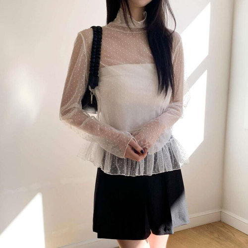 [옷자락]여자 도트 시스루 하이넥 폴라 블라우스 티셔츠