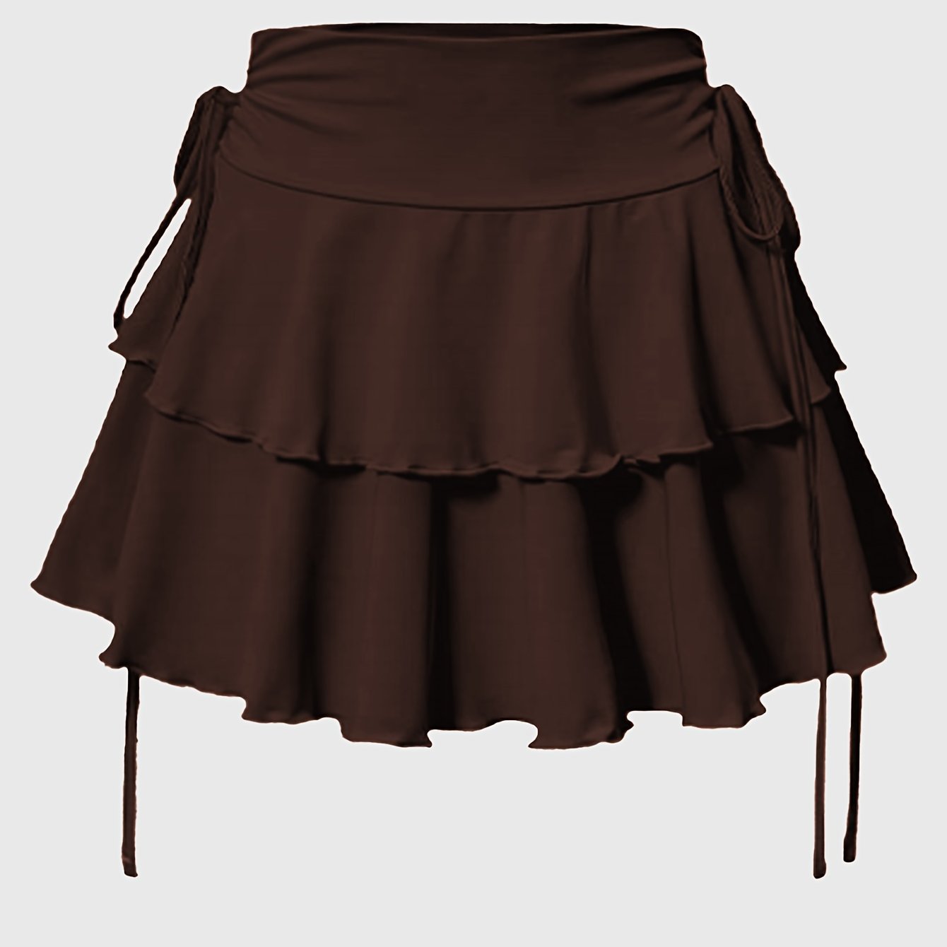 TEMU 우아한 레이어드 러플 스커트 - 여성용, 폴리에스터 블렌드, 단색, 니트 원단, 끈 디테일, 봄/여름/가을용 - 스타일리시한 하이웨이스트 미디 스커트
