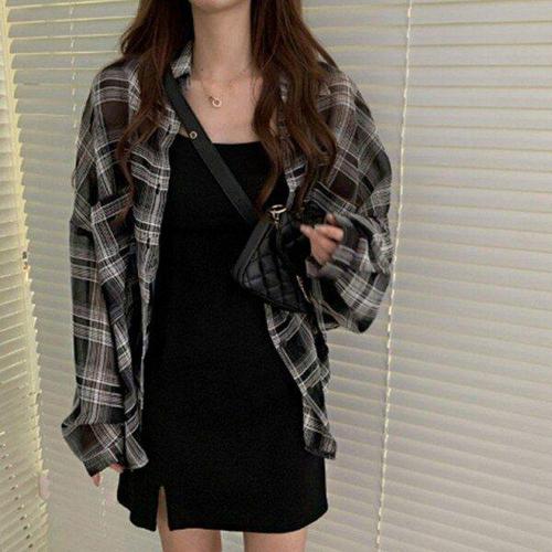 [모노무드]LMO 우먼 슬리브리스 스타일드레스 와이드핏 체크무늬 와이셔츠 셋업 스타일링 레이디 빅핏