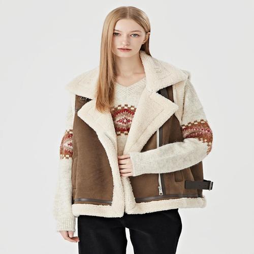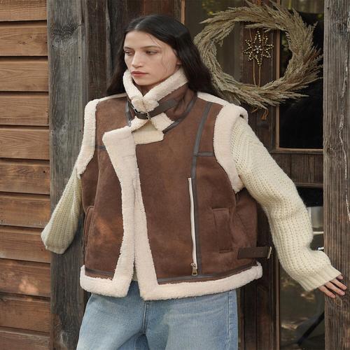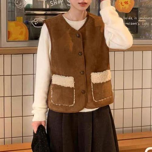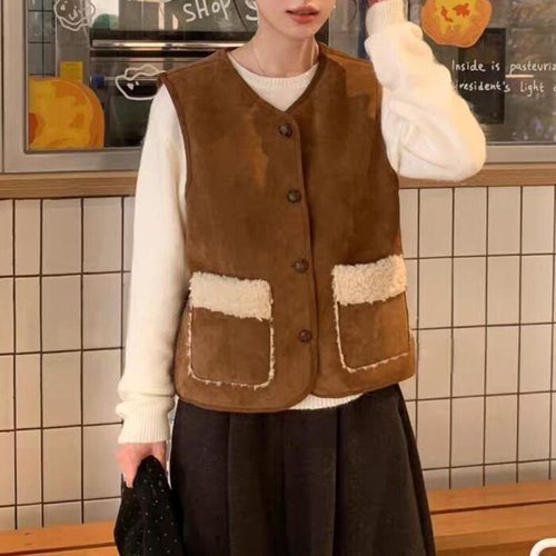 POMTOR 여성 가을 무스탕 스타일 따뜻한 브라운 양털 조끼