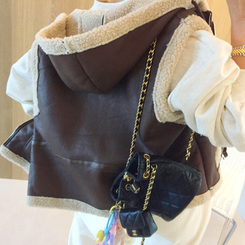 아이미마인 / 피터 배색 양털 뽀글이 가죽 레더 무스탕 세미크롭 후드 조끼베스트 (2color)