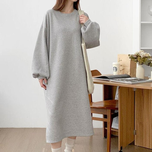 플러리싱 / 오버핏 기모 벌룬소매 무지 맨투맨 롱원피스 플러리