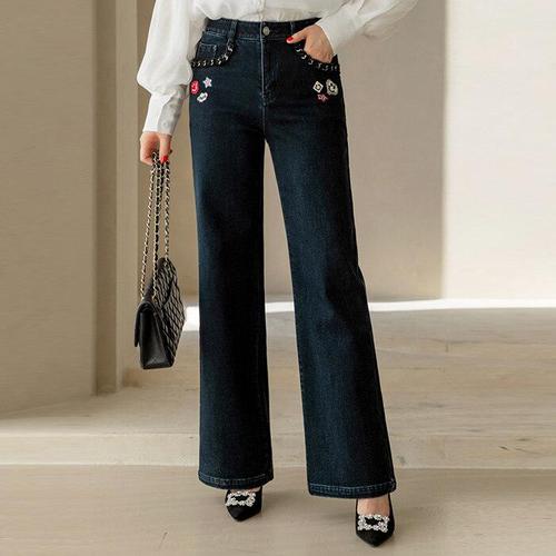 [스타일온미][스타일온미] 안나나 미니 스마일 와펜 체인 포인트 포근 기모 일자 세미 와이드 데님 팬츠